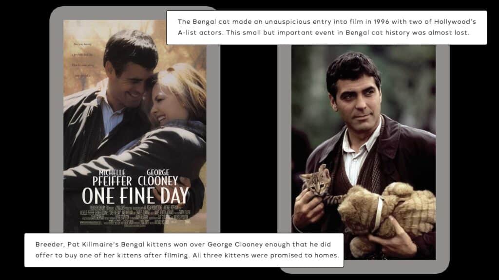 According to Cinema Cats, Bengal cats made their first movie appearance in the film, Proof released in 1991. It featured a Bengal cat with marble markings. The first spotted Bengal in film is 1996's One Fine Day featuring George Clooney and Michelle Pfeiffer.